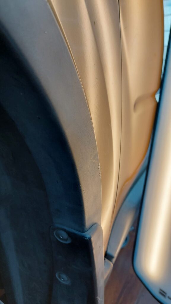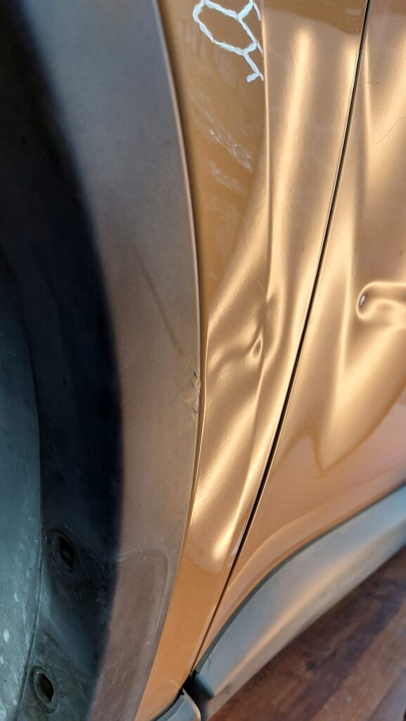 フェンダーの下部に凹みはありますが板金するほどではないので、デントリペアでの修理をご提案させて頂きました!!