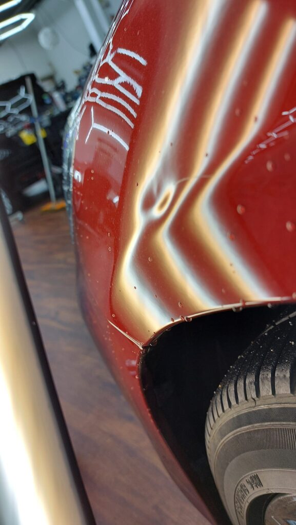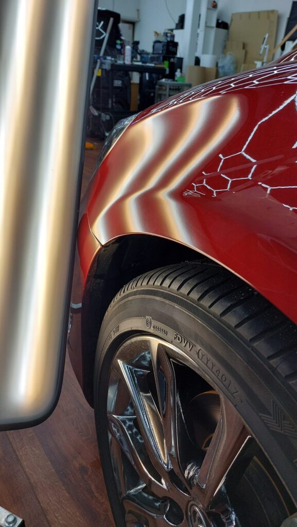 どうでしょうか。先ほどあった凹みは完全に消えて綺麗に直っていますよね(●^o^●)約2時間ほどの作業でここまで綺麗になってお客様も大満足でしたよ(^^♪